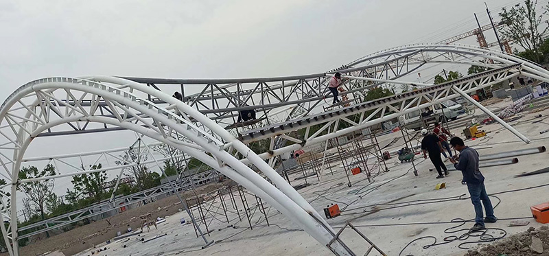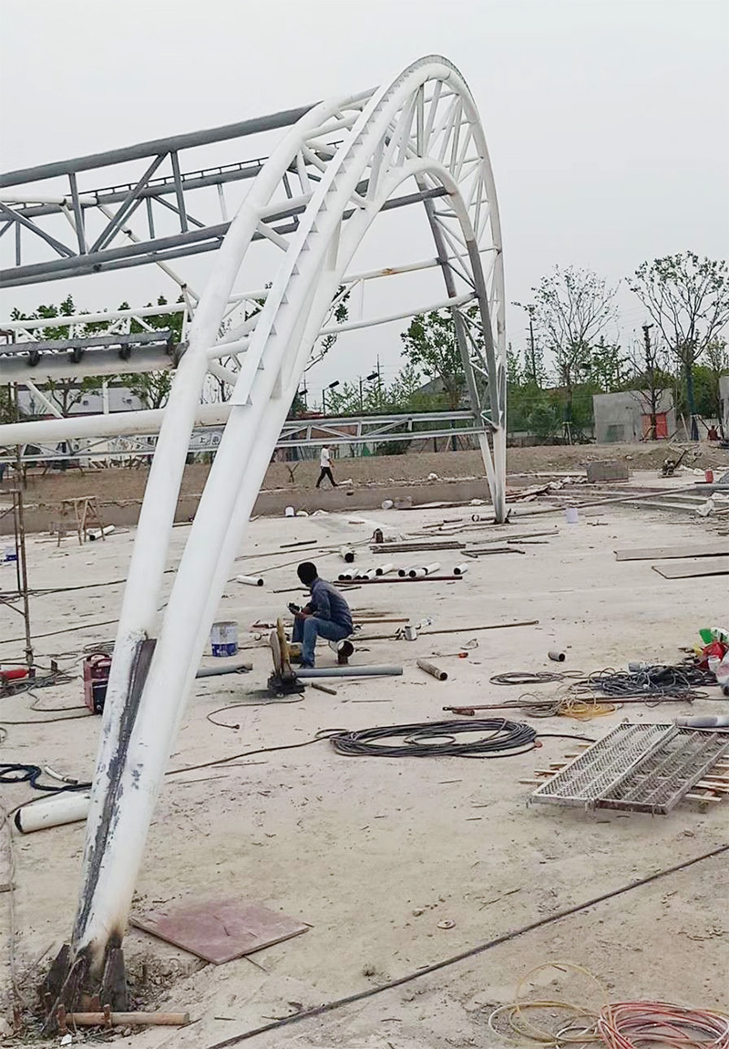对大型的张拉膜结构,要收集安装期间的气象信息。安装过程中要密切注意风向和风速,避免膜体发生颤动现象。在强风或大雨天气要及时停止施工,并采取相应的安全防护措施。